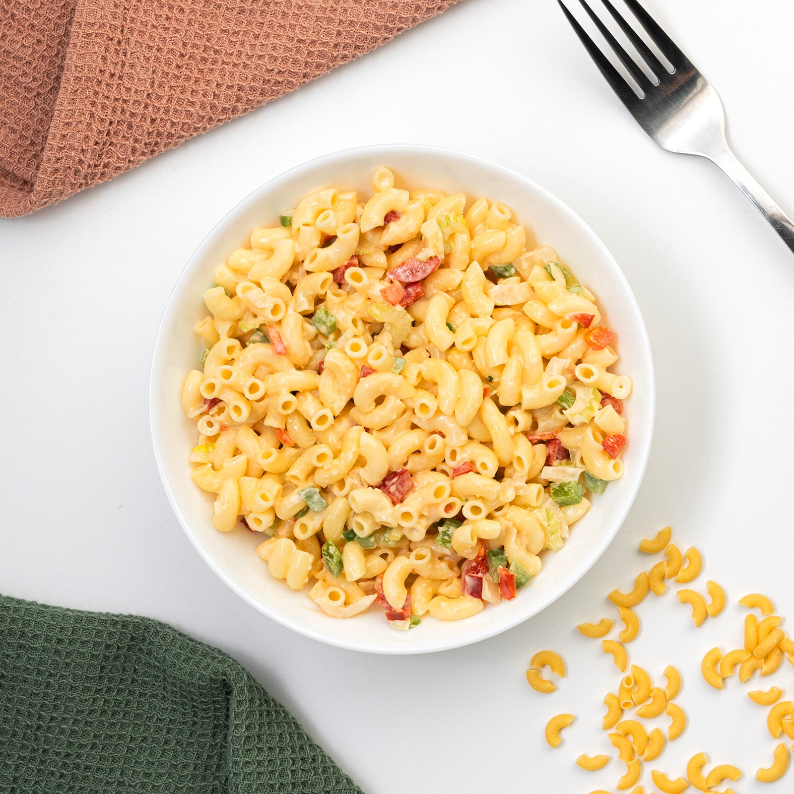 Tender pasta mixed with bell peppers, celery, and onions, dressed in a creamy blend of mayonnaise, vinegar, and spices. A hint of cayenne pepper adds a mild kick, while a touch of sugar brings balance, making it a great choice for any occasion.