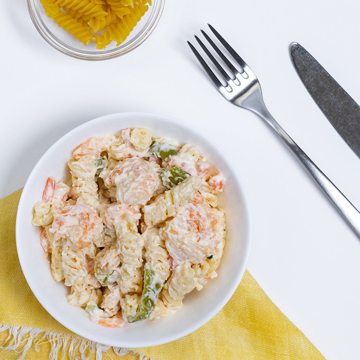 Rotini Pasta, Shrimp, Carrot, Green Bell Pepper, Red Bell Pepper, Salt, Mayonnaise, Garlic, Black Pepper, Cayenne Pepper